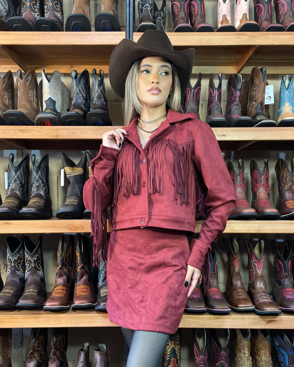 Jaqueta de suedi com bordados no ombro.